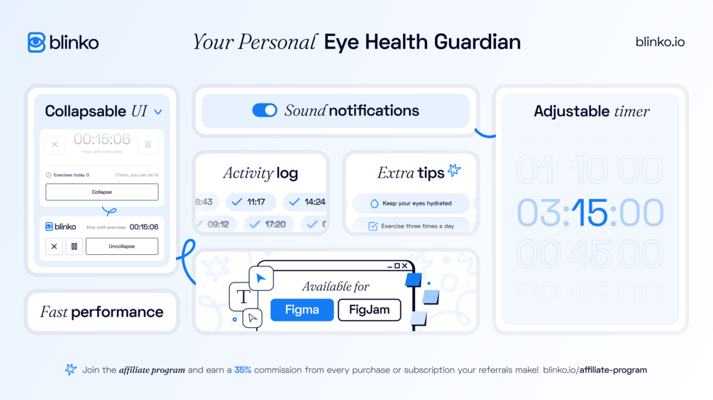 Blinko is the first plugin for Figma and FigJam, designed with your health and productivity in mind. It helps improve your eyesight and prevent eye strain with just a few minutes of daily use.
